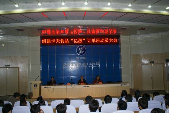 2013年4月10日晚上19:30,数控工程学院在学术会堂举行组建卡夫食品“亿滋”订单班招生动员大会,数控工程学院院长卢文澈、党总支书记南欢、学工办主任侯涛、全体辅导员、机电专业班主任以及2011级机电专业所有学生、2012级部分学生代表共400人参加了会议。会议由数控学工办主任侯涛老师主持。