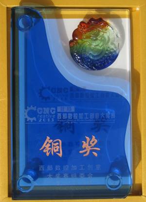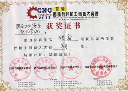 2013年2月26日至3月15日,首届"西部数控加工创意大奖赛"在西安举行,本次大赛分为初赛、复赛和决赛三个阶段。共有来自全省的本科院校、高职院校及企业选送的共有20多件作品参赛,我院作为唯一的高职院校参赛。决赛中经制作人汇报,观众现场打分,评委评议最终确定金奖1名,银奖3名,铜奖5名。 我院选送的"砚盒"经过初赛、复赛和决赛三个环节喜获铜奖。本次大奖赛的评选突出体现了"高端"、"数控加工"和"创意"三个特点,整体评选根据参赛作品从三维造型艺术创意、加工工艺创新、CAD/CAPP/CAM设计能力、高速/精细/复合化数控加工能力等方面由观众现场打分结合专家评委会评议等综合进行评选。 首届"西部数控加工创意大奖赛"由陕西省机械工业协会、陕西省机械工业联合会、陕西省机械工程学会术主办,陕西省机械工程学会数控自动化分会、第十六届西部制博会组委会承办。西部数控加工创意大奖赛作为在我国举办的第一次结合数控加工和创意设计的作品与技能大奖赛,进一步响应我国政府提出的"大力发展高端装备制造业"以及"创新中国"和"文化强国"的号召,目的是充分展示西部装备制造业的机械加工实力和技能,深入调动机械加工人才使用高端数控加工设备、钻研加工技术的积极性、主动性和创造性,将先进科技与文化艺术有机融合并进一步提升。 本次大赛荣誉的获得充分体现了我院参赛选手的团队协作能力、数控加工能力和创意水平。我院的参赛作品"砚盒"主要由数控工程学院杨勇、陶静老师制作完成,作品美观,实用,有深刻的寓意,是技术与艺术的完美结合,是软件与数控技术的结合。本次大赛得到了学院领导的高度重视与支持。本次大赛为教师和企业选手提供了交流经验的平台,加强了学校核心竞争力,促进了数控技术新的跨跃。