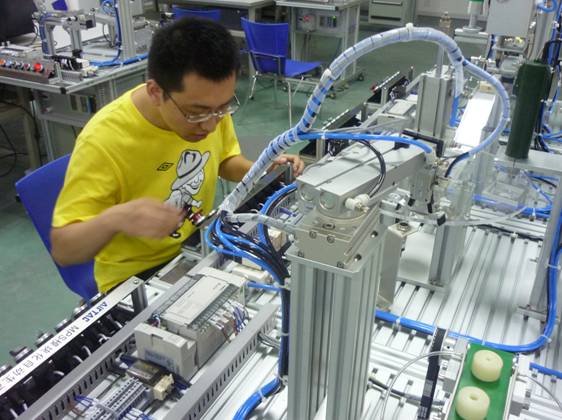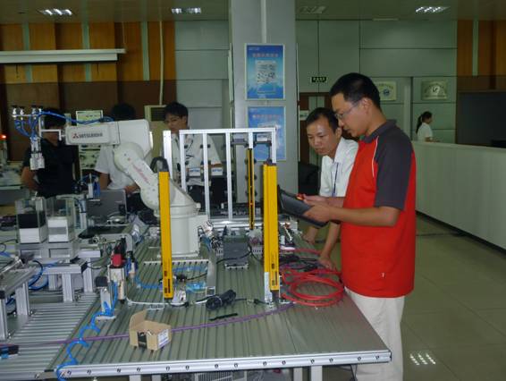 培训的主要容包括气动、液压、PLC、伺服控制、变频器、总线等技术应用。学习过程中两位老师积极和全国其他高职院校的老师一起学习、交流信息化手段在教学中的应用,主要包括交互式word格式电子试卷制作、交互式flash格式电子试卷制作、交互式flash格式视频教学类课件、交互式flash格式教学媒体素材制作、基于网络多媒体课件及网络课程开发、网络可见动态菜单制作及网络课程资源整合等。进一步学习、探讨了高职院校与企业的合作模式,建立有效及长效的合作机制,使校企合作真正达到双赢的目标。8月20日~8月24日培训班前往浙江奉化的亚德客(中国)有限公司进行学习,主要包括模块化自动化生产线MPS中PLC软件使用、传感器的应用、步进电机的应用、变频器的应用、伺服电机的应用、触摸屏的应用以及柔性组装系统FAS、机器人的应用等。