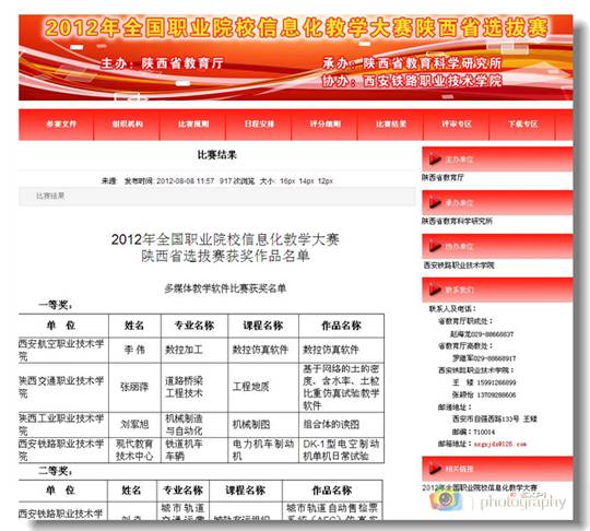 8月8日,2012年全国职业院校信息化教学大赛陕西省选拔赛成绩揭晓。数控学院副院长刘军旭获“多媒体教学软件比赛”一等奖。陕西工院共有4位教师获得一等奖,3位教师获得二等奖。全省共有10名教师获得一等奖。一等奖获得者刘军旭、王艳芳、耿凡娜、赵宏强还将代表陕西参加全国比赛。