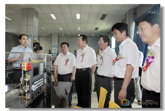在党委书记邓志辉、院长崔岩和相关职能部门负责人陪同下,郭永平等领导实地考察了我院新落成的发那科数控系统应用中心、欧姆龙工业自动化实训中心和数控、电气、机械、材料等实训基地,深入了解我院实验实训设施建设及教育教学改革情况。郭永平同志对我院近年来的办学业绩给予高度评价,并希望我院充分利用好优势突出的实验实训平台和资源,努力提升服务学生成长成才,服务行业社会发展的能力和水平。