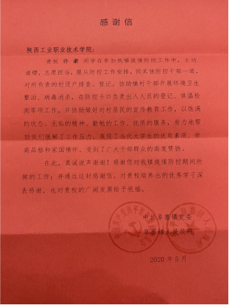 7月16日,航空工程学院收到兴平市阜寨镇政府和汉台区东关街道办事处对我院机电1802班许豪同学、机电1907班李一哲同学的两封表扬信,信中分别对两名同学的疫情防控志愿服务工作进行了表扬与感谢。